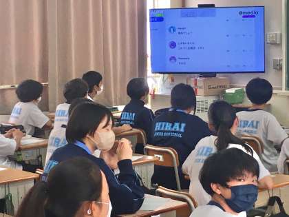 1年生5組の授業(技術)の様子 公開日 2022/07/07 更新日 2022/07/07 学校 7日(木)、1年生5組の2時間目は、技術の授業でした。夏休みをひかえ、SNSの長所・短所やネット社会をスムーズに過ごす方法について考えていました。