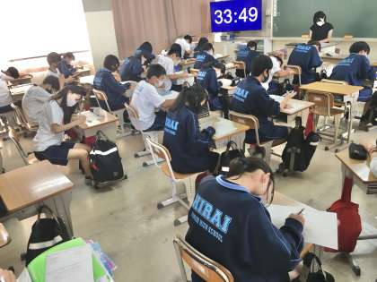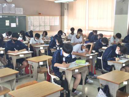 11日(月)、2年生2組の3時間目は、担任の先生による数学の授業でした。生徒は、既習内容を振り返るワークシート課題に取り組んでいました。