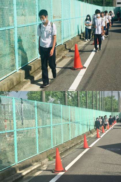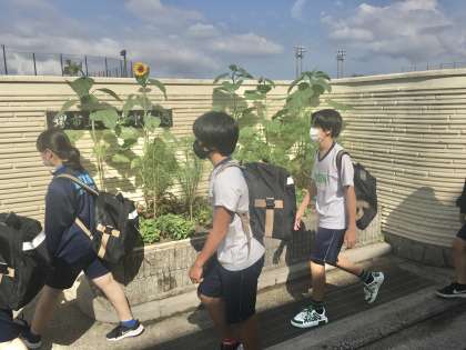 13日(水)の登校の様子です。今週になって開花したひまわりが、正門前で生徒を出迎えてくれています。