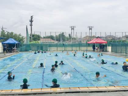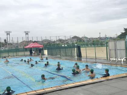 1年生1・2組の授業(保健体育)の様子 公開日 2022/07/14 更新日 2022/07/14 学校 14日(木)、1年生1・2組の2時間目は、保健体育の授業でした。曇天の中、水泳の学習が行われていました。