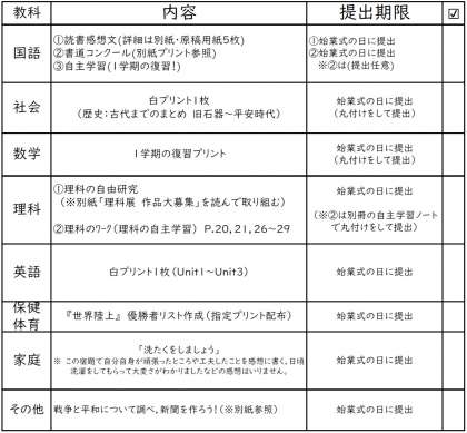 1年生:夏休の宿題2022一覧! 公開日 2022/07/19 更新日 2022/07/19 学校 各教科から課題が出ています。すべての課題提出期日が、8月25日(木)となっています。確実に提出できるように計画的に取り組んでいきましょう!