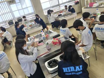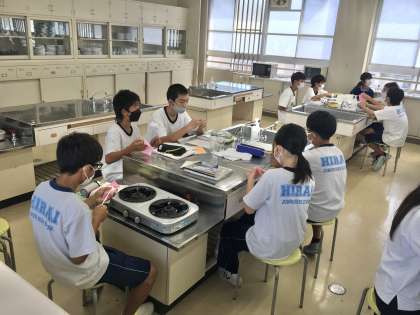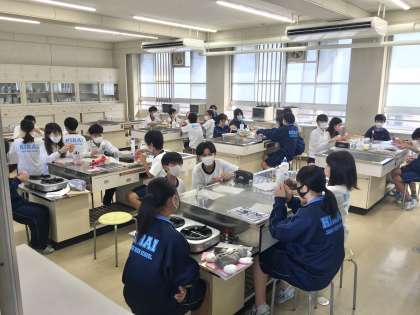 6日(火)、1年生2組の1時間目は、調理室での家庭科の授業でした。実習作業を通して、どの汚れにはどんな洗剤が適しているのか調べていました。