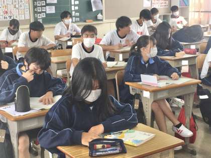 7日(水)、2年生6組の1時間目は、国語の授業でした。教材「盆土産」の第1段落で、速達の知らせで父親の帰郷を知った少年が、「えびフライ」という言葉をつぶやいているときの心情について考えていました。
