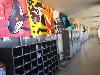 各クラスで作成された「学級旗」が職員室前に一斉に掲示されています。今月22日(木)に行われる体育大会に向けて雰囲気がより盛り上がってきています。