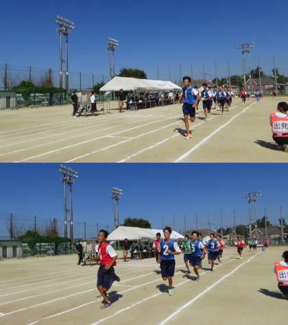 No.1 男子1500m走 〜体育大会種目紹介〜 公開日 2022/09/16 更新日 2022/09/16 学校 男子の長距離走種目は、1500m走です。学年混成の競技で、先輩の負けられない気持ちと後輩のレースに挑む果敢な意志のぶつかり合いが注目のレースです。 序盤のレース展開が、記録更新をめざすハイペースで進むのか、お互いの心理戦が表出するスローペースで進むのかがポイントです。 ※写真は、16日(金)の予行時の様子です。