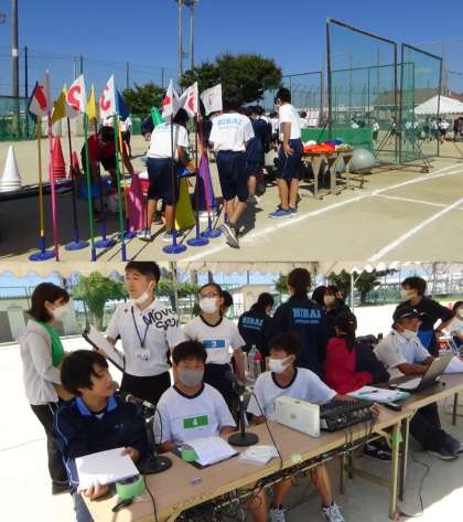 大会当日では、トラックやフィールドで活躍する選手だけでなく、競技運営をサポートするビブスを着用した生徒たちの様子にもご注目ください。