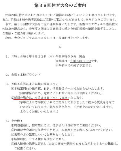 明日、22日(木)体育大会の観覧でご来場される際の注意点です。下記の点について、再度ご確認していただき、ご理解・ご協力をお願いします。