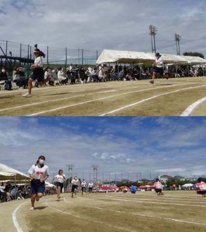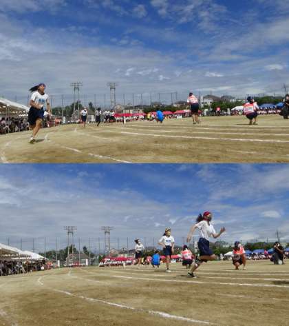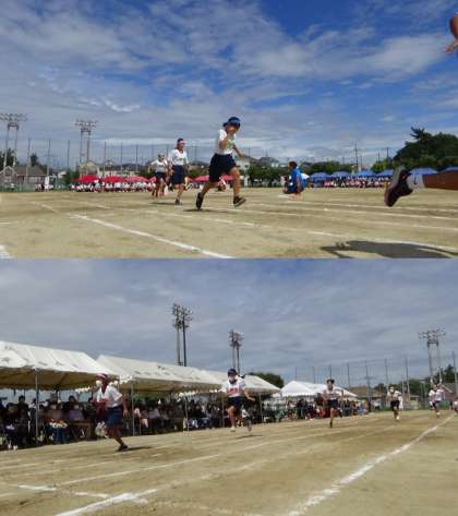 100m走は、第1曲走路の直前からのスタートでした。曲走路後の最後の直線30mでは、激しい全力疾走の勝負が見られました。