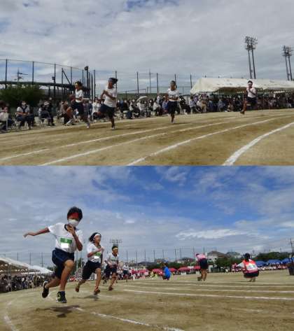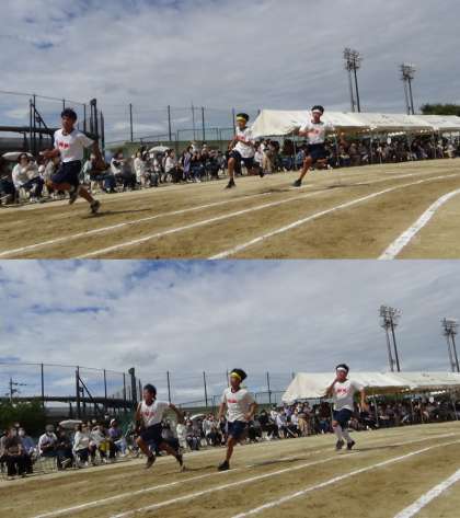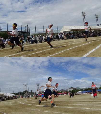 100m走(男子の部)〜第38回体育大会〜 公開日 2022/09/23 更新日 2022/09/22 学校 スタート地点は、保護者観覧席の真ん前でした。観覧席からは、「がんばって!」という拍手の声援が終始鳴り響き、選手の気合も否応なしに高まりました。 レースでは、9年ぶりに、1年生の部の記録が更新されました。