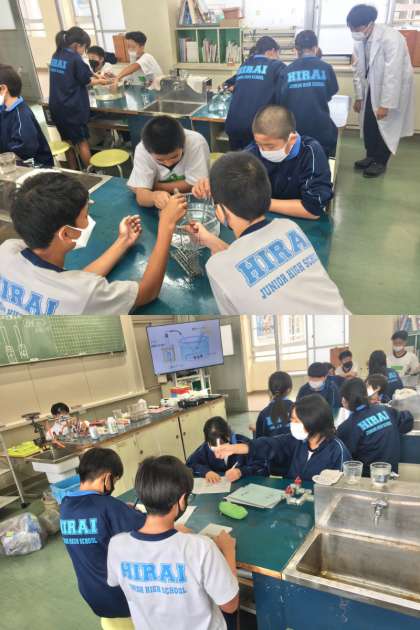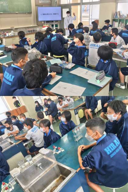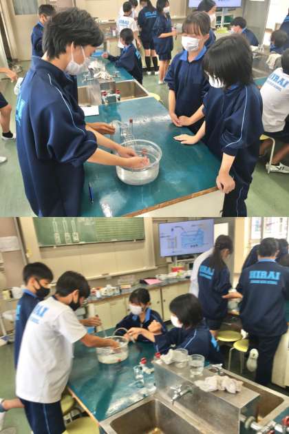 1年生は、理科の授業で、気体の性質について学習しています。二酸化酸素や酸素を実際に捕集して、その性質について調べています。