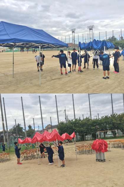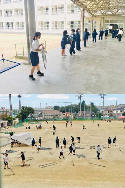 準備作業〜第38回体育大会〜 公開日 2022/09/21 更新日 2022/09/21 学校 21日(水)の放課後、部活生が中心となって体育大会に向けた準備作業を行いました。予行準備と同様に作業をスムーズに進めてくれたので、予定よりも早く終えることができました。ありがとうございました。 なお、体育大会は、天候状況により、開会が早くなる場合がありますので、生徒の皆さんは、時間に余裕をもたせて登校しましょう。