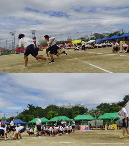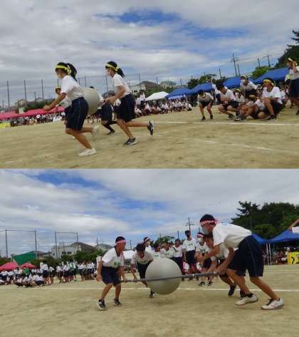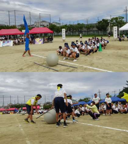 1年生学年種目:つなげ!平井魂!〜第38回体育大会〜 公開日 2022/09/24 更新日 2022/09/23 学校 1年生の学年種目は、「つなげ!平井魂!」でした。生徒は、4人1組で棒の端を持って、大きなボールを挟み込んで運ぶリレー形式の種目に挑みました。