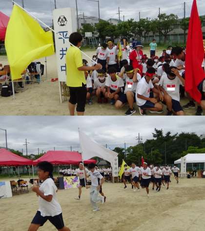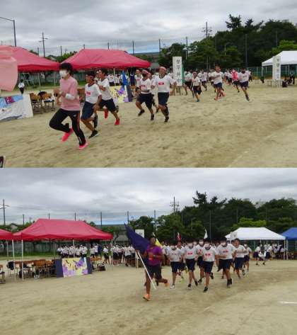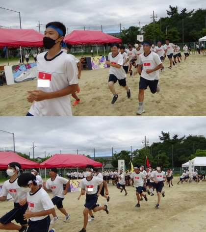 クラスカラーを示した旗を掲げた各担任が学級生徒を先導しました。