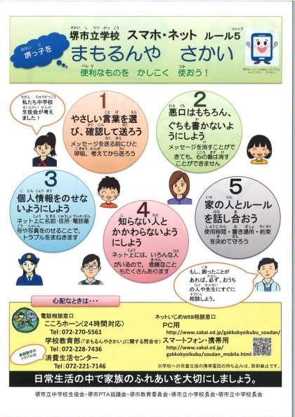 1年生:「スマホ・ケータイ安全教室」を受講 公開日 2022/10/03 更新日 2022/10/03 学校 30日(金)、1年生は、6時間目に、講師先生をNTTドコモさんにお願いし、「スマホ・ケータイ安全教室」を受講しました。生徒にとっては、スマートフォンや携帯電話の利用に関連した危険やトラブルを未然に防ぐための方法について改めて考える機会になったようです。 ご家庭におかれましても、スマートフォンや携帯電話の使用時間、場所、その他の約束事などを再確認していただければと思います。