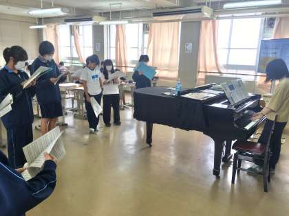 3年生1組の授業(音楽)の様子 公開日 2022/10/06 更新日 2022/10/05 学校 5日(水)、3年生1組の4時間目は、音楽の授業でした。コーラスコンクールに向けて合唱曲「遥か」をパート別で練習していました。