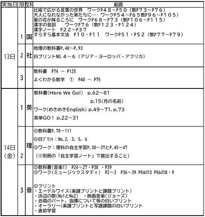 1年生:中間テスト範囲表の配付 公開日 2022/10/06 更新日 2022/10/06 学校 1年生では、来週13日(木)と14日(金)に実施される中間テストの範囲表が配付されています。週末の連休を有効に活用し、テストに備えておきましょう。
