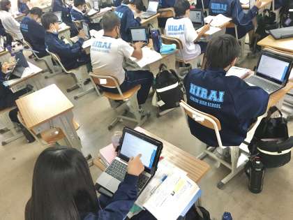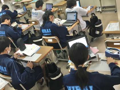 1年生4組の授業(国語)の様子 公開日 2022/10/11 更新日 2022/10/07 学校 7日(金)、1年生4組の1時間目は、国語の授業でした。生徒は、出題された課題を解くためのヒントを生徒用コンピューターで調べていました。