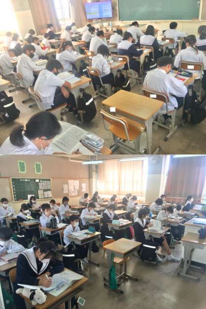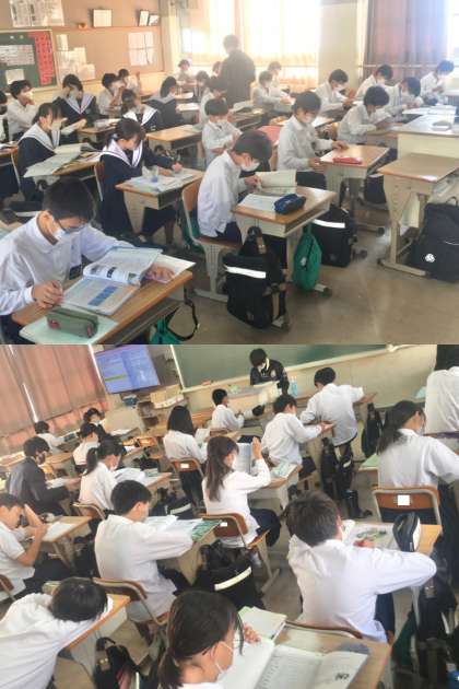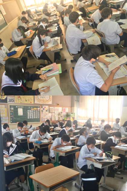 1年生:中間テスト2日目 公開日 2022/10/14 更新日 2022/10/14 学校 14日(金)は、中間テストの2日目でした。受験教科は、英語、理科、音楽でした。 ※写真は、(上)から順に、理科の試験を受ける1〜6組の様子です。