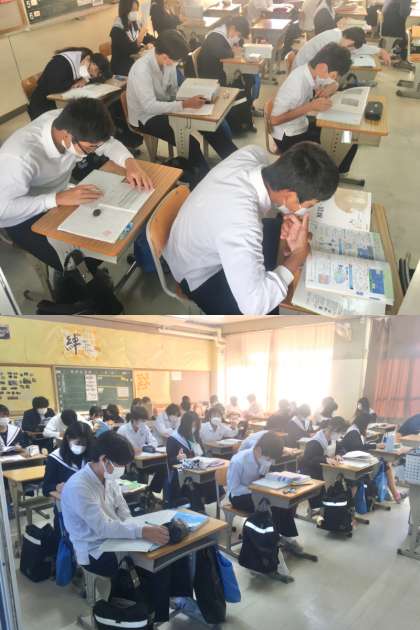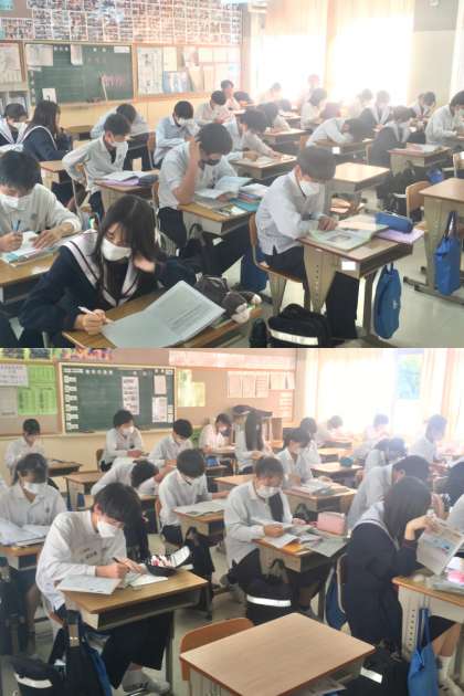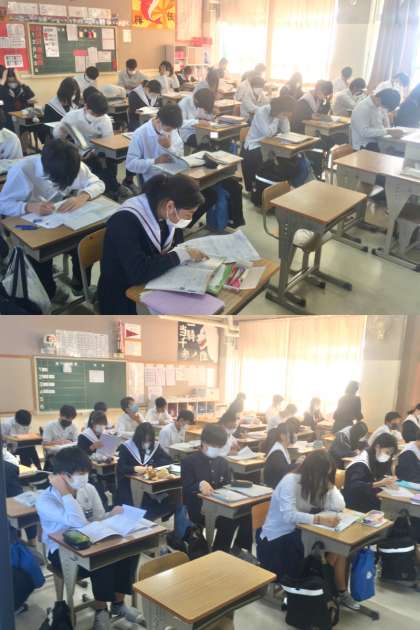 3年生:中間テスト 2nd Day 公開日 2022/10/14 更新日 2022/10/14 学校 14日(金)は、3年生にとって大切な中間テストの2日目でした。試験前には、テスト勉強に真剣に励む様子が見られました。 写真は、(上)から順に1〜6組の様子です。