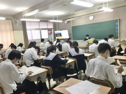 17日(月)、3年生1組の1時間目は、数学の授業でした。先日行われた中間テストの答案用紙が返却され、生徒は、正答できなかった問題のやり直しに取り組んでいました。