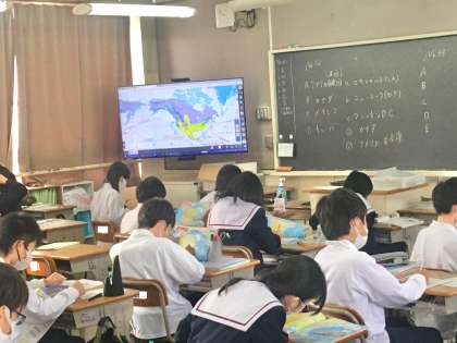 1年生の社会の授業では、中間テストが終わり、北アメリカ大陸や西インド諸島の国々からなる北アメリカ州についての学習が始まっていました。