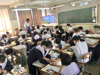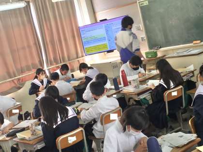 1年4組の授業(技術)の様子 公開日 2022/10/21 更新日 2022/10/21 学校 21日(金)、1年4組の2時間目は、技術の授業でした。生徒は、立体を等角図のルールにそって平面で描き表す課題に取り組んでいました。