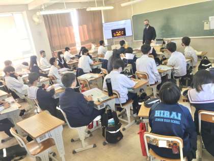 2年生の英語Bの授業では、NSの先生がハロウィンの起こりやコスチュムームの意味について説明をしてくれています。生徒は、興味深げに、説明を聞いています。
