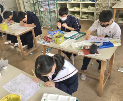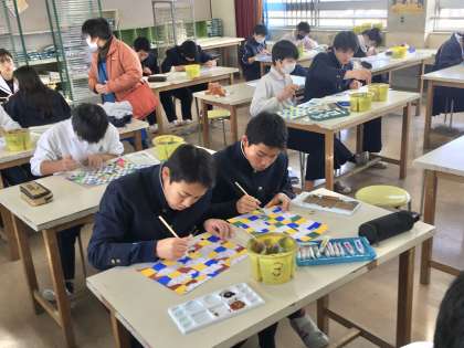 2年生:美術の授業〜色面構成〜 公開日 2022/12/07 更新日 2022/12/07 学校 2年生は、美術の授業で、色面構成のデザインに取り組んでいます。生徒は、さまざまな色の濃淡を工夫しながら彩色をしているようです。 ※写真は、6組の授業の様子です。