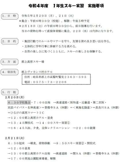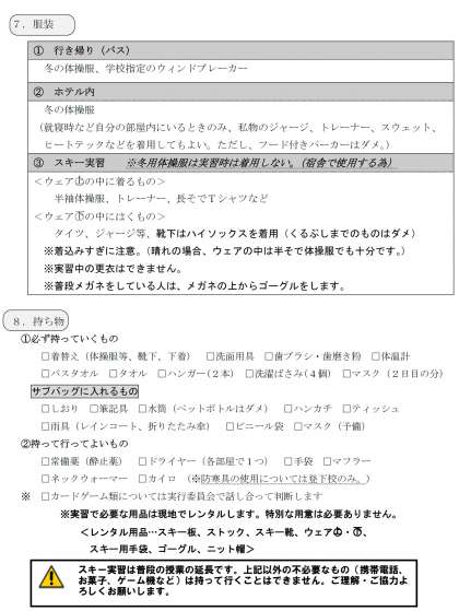 1年生:6 Days Left To スキー実習 公開日 2023/02/14 更新日 2023/02/14 学校 1年生の修学旅行まで、14日(火)段階で、あと6日とせまってきました。 今週末、18日(土)には、当日の行程や持ち物を最終確認する事前指導集会が予定されています。 実習実施日の間際になって慌てないように、必要な持ち物の用意を少しずつしていきましょう。