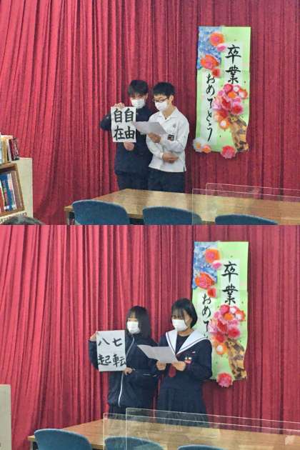 先輩!Thank you ! 〜3年生を送る会〜 公開日 2023/03/08 更新日 2023/03/08 学校 8日(水)1時間目に、3年生の新たな門出を祝すための3年生を送る会(主催:生徒会)がテレビ集会形式で行われました。 卒業をひかえた3年生に、生徒会や各クラブ活動の代表生徒から、勇気が湧くようなあたたかいメッセージが送られていました。