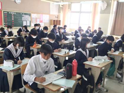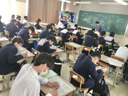 2年生は、理科の授業で、地震のゆれについて復習しています。初期微動や主要動がどのような速さで伝わっていくのかについて理解を深めています。