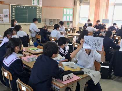 生徒は、グループの中で自身の意見を伝えたり、他の人の考えを聞いたりしています。