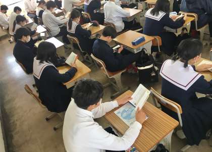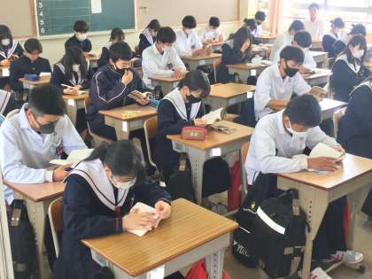 朝の読書活動〜堺スタンダード〜 公開日 2023/05/10 更新日 2023/05/10 学校 本校では、「堺スタンダード」の1つ、朝の読書活動に取り組んでいます。 生徒は、静かな朝の始業時間をむかえることができています。 ※写真は、3年7組の様子です。