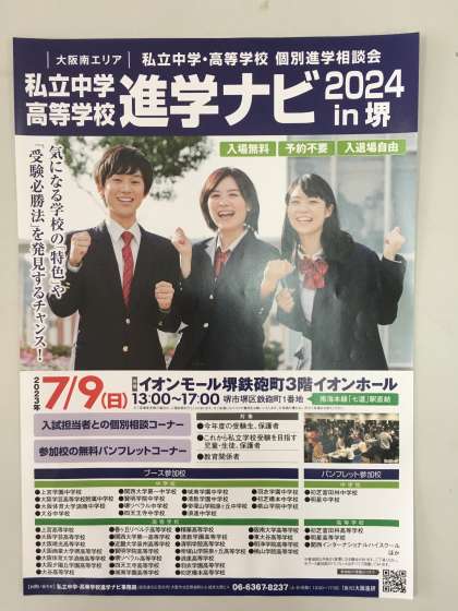 私立高校個別相談会「進学ナビ2024in堺」が、7月9日(日)午後1時〜午後5時の間、イオンモール堺鉄砲町にて開催されます。予約不要です。