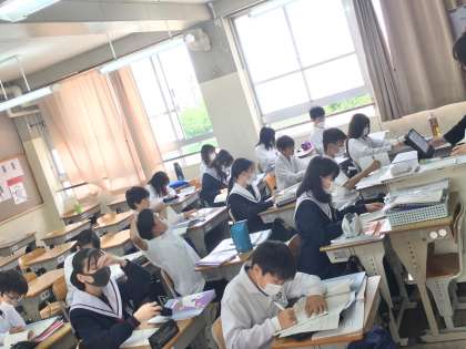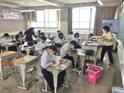 1年生の英語の授業では、在籍学級の教室または英語少人数教室(B棟3階1年1組横の教室)で授業を受けるグループに分かれて、生徒は学習しています。