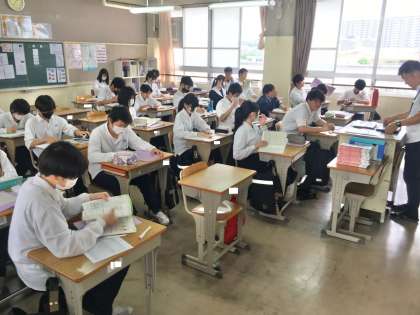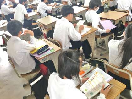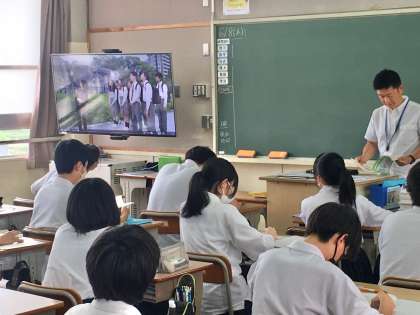 3年生6組の授業(英語)の様子 公開日 2023/06/08 更新日 2023/06/08 学校 8日(木)、3年生6組の5時間目は、英語の授業でした。 教科書本文中の登場人物が広島を訪問した場面の再現ドラマを大型テレビで視聴していました。