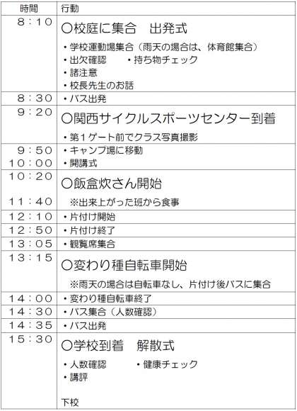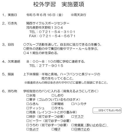 1年生では、18日(金)に校外学習が予定されています。実施場所は、関西サイクルスポーツセンターです。