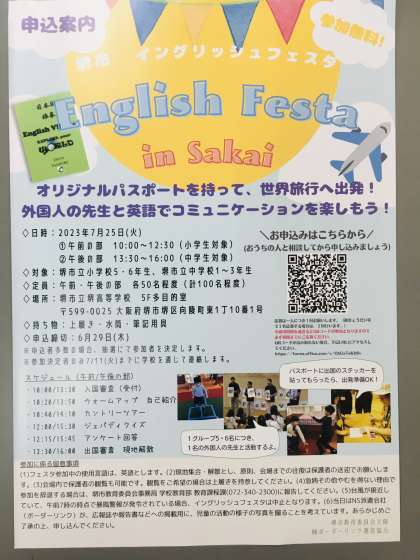 7月25日(火)に堺市立堺高校にて、English festa in Sakaiが行われます。参加には事前の申込みが必要です。