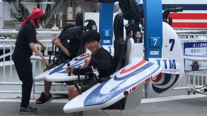 離陸直前の笑顔です。 今から、高さ32mで高速旋回するテンテコマイにチャレンジです。