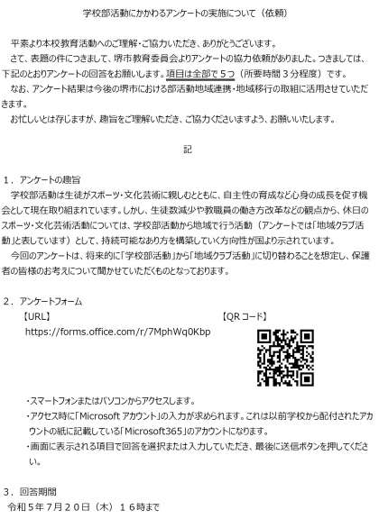 表題の件につきまして、堺市教育委員会よりアンケートの協力依頼がありました。つきましては、アンケートの回答にご協力をお願いします。項目は全部で5つ(所要時間3分程度)です。
