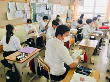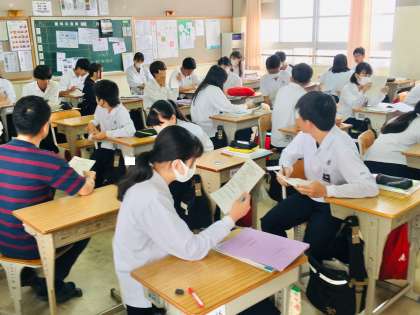 席の近くの人どうしで、英語の簡単な質問に答える活動が行われていました。