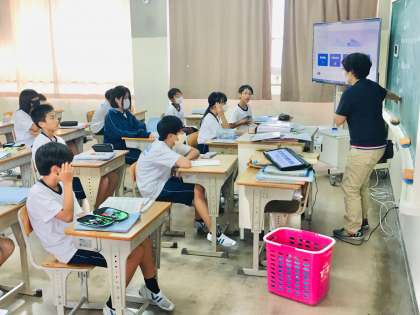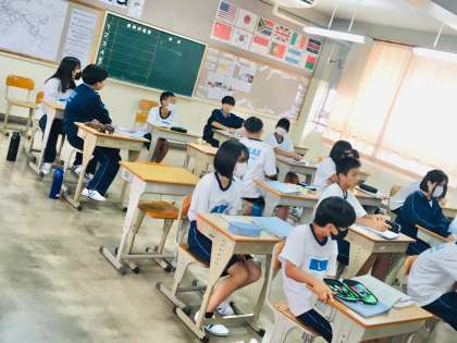 1年生の英語の授業では、在籍学級の教室または英語少人数教室(B棟3階1年2組横の教室)で授業を受けるグループに分かれて、生徒は学習しています。