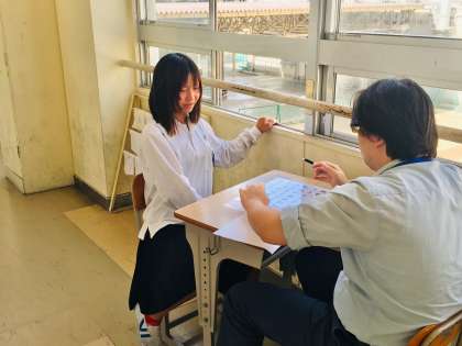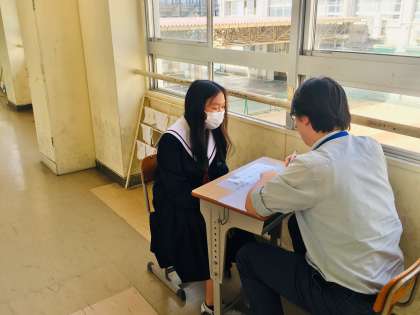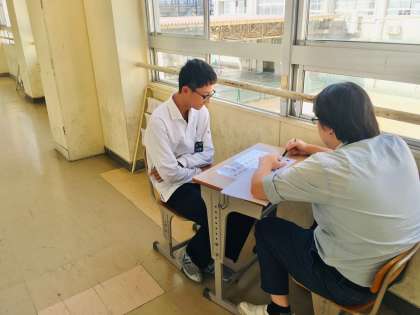 1年生5組の授業(英語B)の様子 公開日 2023/10/11 更新日 2023/10/11 学校 11日(水)、1年5組の4時間目は、英語Bの授業でした。 授業では、1対1形式のーパフォーマンステストが始まっていました。