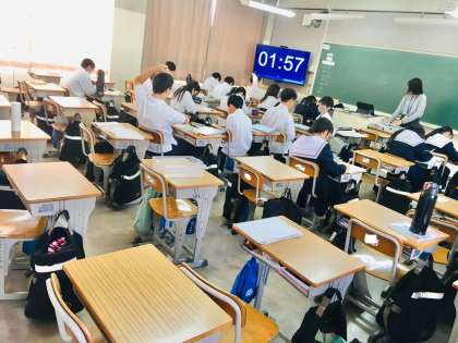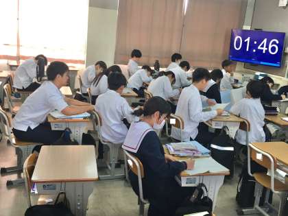 在籍学級の教室または英語少人数教室(南館B棟3階:1年2組横の教室)で授業を受けるグループに分かれて、生徒は学習していました。