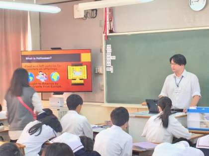 3年生: 英語Bの授業 〜Holloween Lesson〜 公開日 2023/10/16 更新日 2023/10/16 学校 3生の英語Bの授業では、NSの先生がハロウィンの起こりやコスチュムームの意味について説明をしてくれています。 生徒は、興味深げに、説明を聞いています。 ※写真は、3組の授業の様子です。