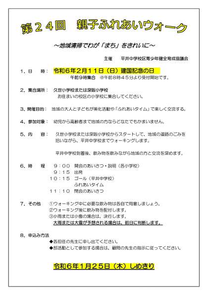 平井中学校区青少年健全育成協議会の主催で、2月11日(日・祝日)に「第24回親子ふれあいウォーク」が行われます。美化活動を通して地域の大人と子どもが交流を深めるイベントです。