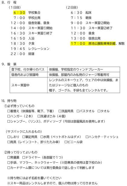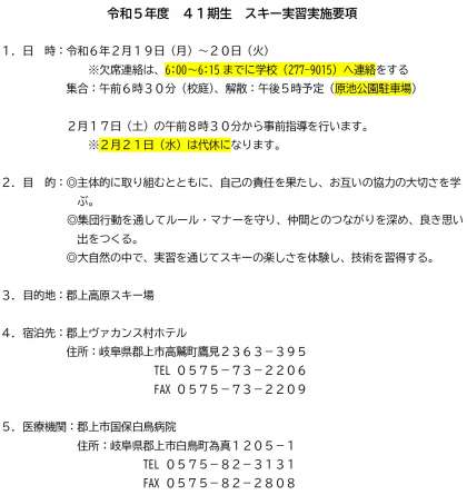 1年生では、本日19日(月)より1泊2日の予定で、スキー実習を行います。