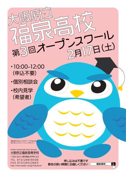3年生:福泉高校「オープンスクール」のご案内〜進路選択〜 公開日 2024/02/05 更新日 2024/02/05 学校 大阪府立福泉(ふくいずみ)高校にて、2月17日(土)午前10時から正午までの間、個別による入試相談会や施設案内が行われます。自身の都合の良い時間に来校できるようです。 事前の申込みは、不要です。受験を考えている人は、参加を検討しましょう。