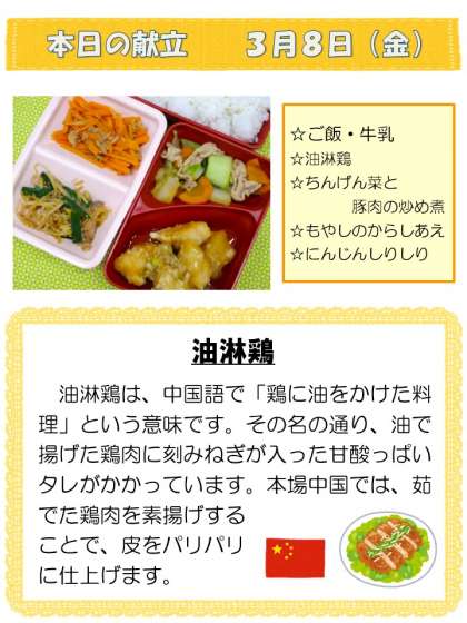 中学校給食の献立【最終】 公開日 2024/03/08 更新日 2024/03/06 学校 本日の献立です。 本日をもって本校の給食実施日は最終となりました。来週以降は、全学年とも午前中のみの授業となります。配膳員の皆さま、1年間どうもありがとうございました。