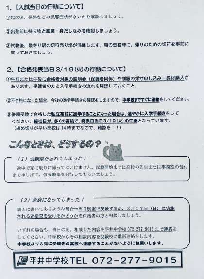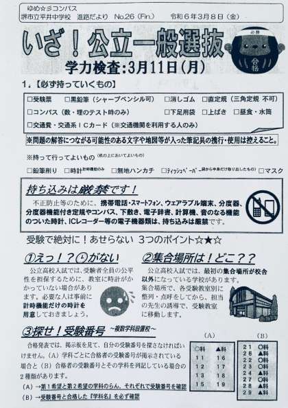 3年生は、8日(金)4時間目に、来週11日(月)に行われる公立一般選抜に向けて学年集会を行いました。集会では、携行すべき持ち物や受験当日体調不良になったときの対応方法などについて確認しました。